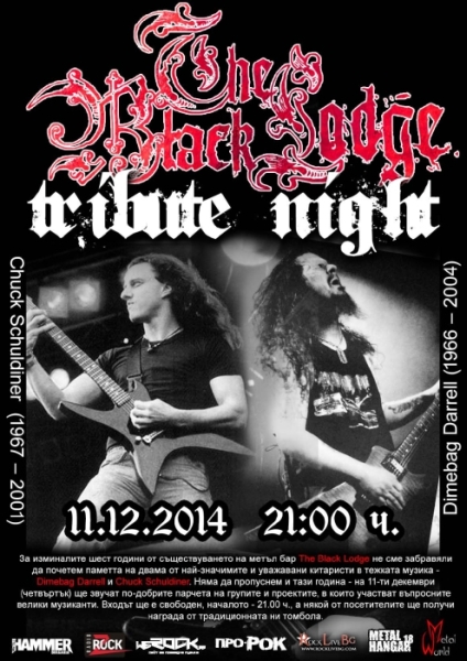 За изминалите шест години от съществуването на метъл бар "The Black Lodge" не сме забравяли да почетем паметта на двама от най-значимите и уважавани китаристи в тежката музика - Dimebag Darrell и Chuck Schuldiner. Няма да пропуснем и тази година - на 11-ти декември (четвъртък) ще звучат по-добрите парчета на групите и проектите, в които участват въпросните велики музиканти. Входът ще е свободен, началото - 21.00 ч., а някой от посетителите ще получи награда от традиционната ни томбола.