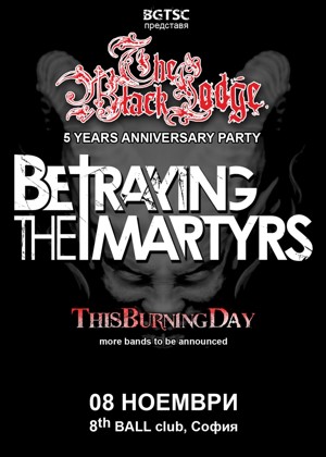 BGTSC има удоволствието да обяви официално концерта на BETRAYING THE MARTYRS. Парижките екстремисти ще забият на 8 ноември в столичния клуб 8 Ball. Събитието е по случай петата годишнина от отварянето на столичния бар The Black Lodge и съвпада с източноевропейското турне на бандата. Към празника на емблематичният столичен бар се присъединяват и родните любимци This Burning Day, като може да очаквате обявяването на още участници.